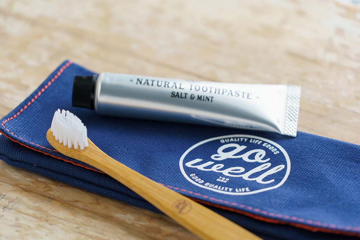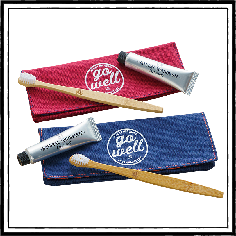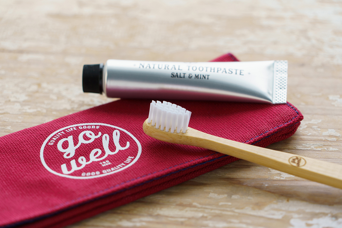 セットの竹製オリジナル歯ブラシは、竹はプラスティックと異なり生分解性なので自然にも優しいエコでエシカルな歯ブラシです。
