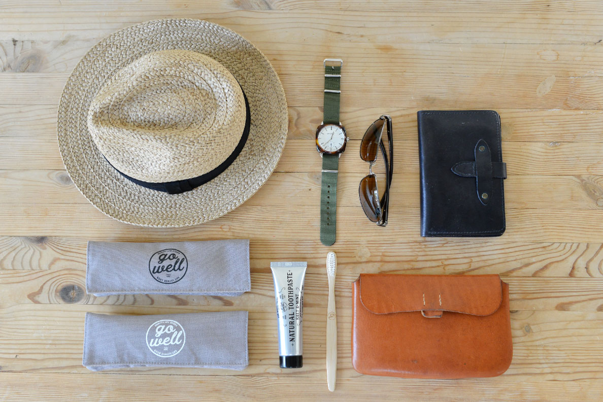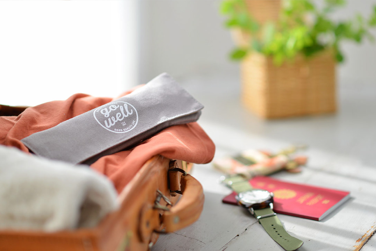 go well トラベルセットのポーチは赤と青の2種類。表地に綿帆布(コットン)を使用し、通気性もよく、乾きやすくできています。汚れても洗えるので清潔にお使いいただけます。使い込むと味わいも出てきて良い感じになっていきます。